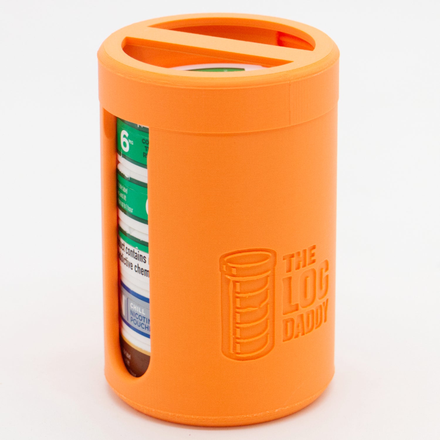 The Log Daddy™ is the perfect portable companion to contain your 5 cans of smokeless tobacco pouches. Gone are the days of loose cans rattling around your console or work bench. Keep your cans of dip neatly organized and in one place with The Log Daddy™.